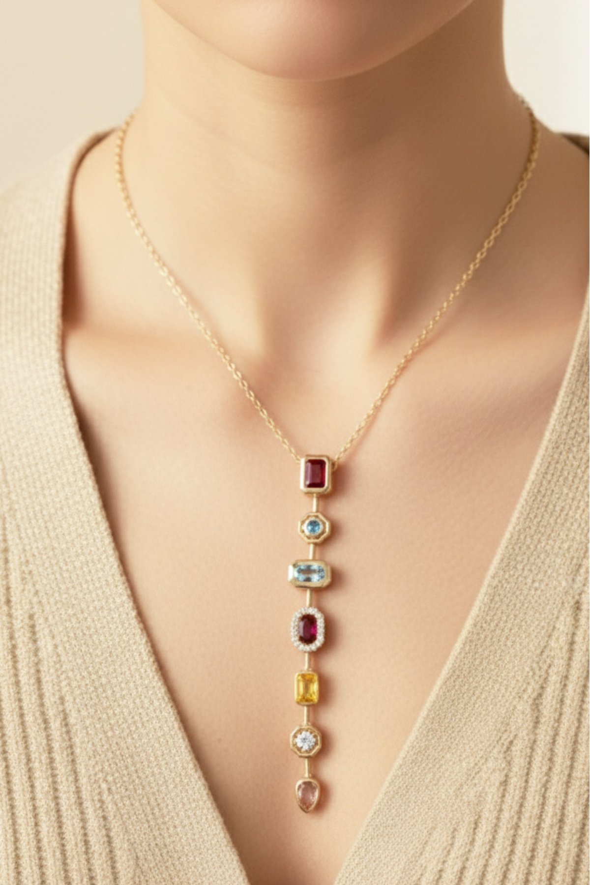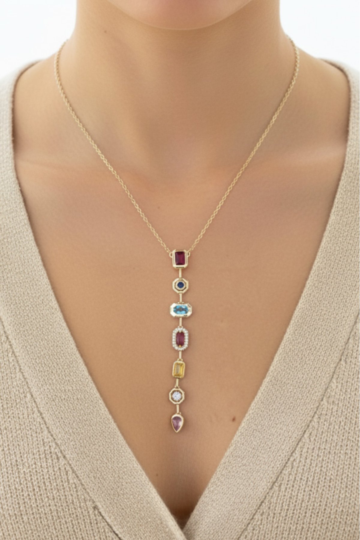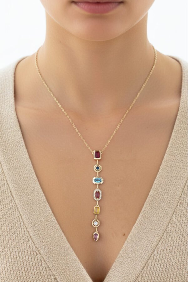 Cheng 14K Renkli Taşlı Kırmızı Y Zincir Kolye 50 cm | Altın Renkli Kararmaz Kadın Takı Pirinç Kolye