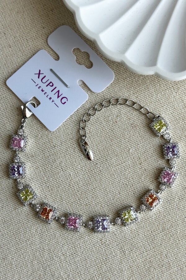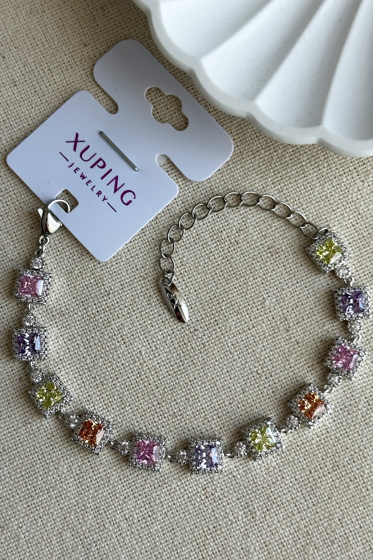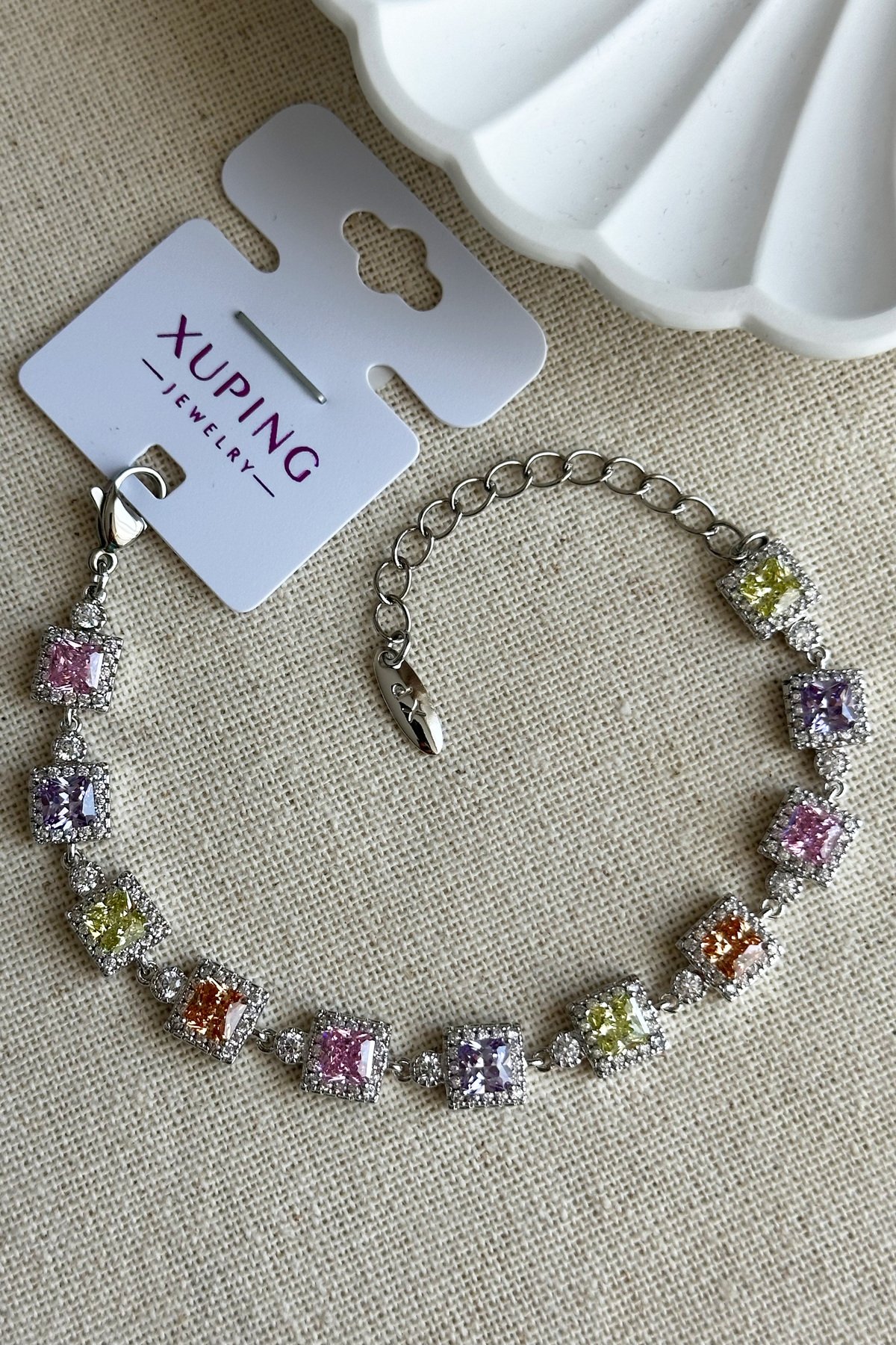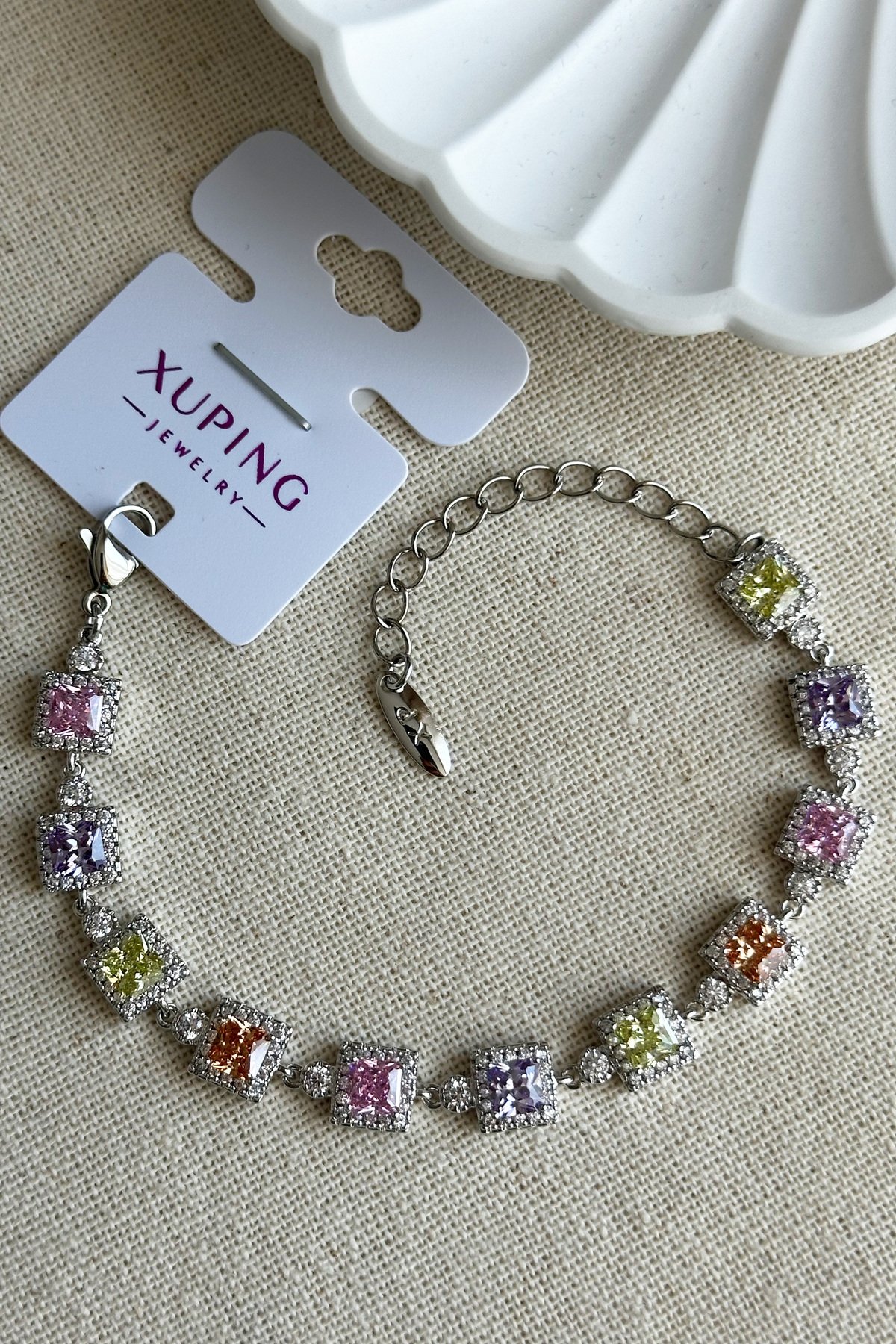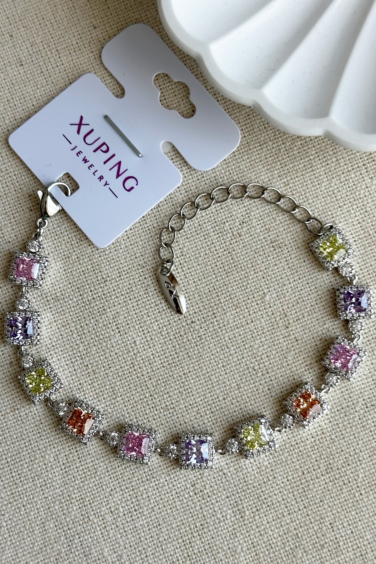 Xuping Renkli Taşlı Kare Kadın Bileklik – 16+3 cm | Gümüş Renk Kararmaz Xuping Takı